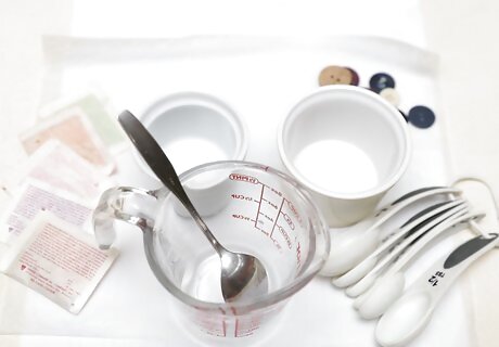 Gather your dyeing materials. You will need containers to hold your dye baths, a measuring cup and measuring spoons, a stirring spoon, and dye. You should have a bowl or plastic container for each color you plan on using. Each one should be able to hold one cup of liquid. Make sure your containers can withstand hot water. You can find dye at local hobby and craft stores in sections with other fabric craft supplies. Rit is a good all-purpose brand of dye to use for dyeing your buttons. If you choose another brand, read the label to ensure you will be able to dye your plastic buttons. It’s best to use a disposable or stainless steel spoon to stir. If you choose to dye your buttons with ink, you’ll need alcohol-based ink, cotton swabs, and a sealer like mod podge.