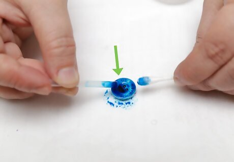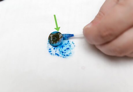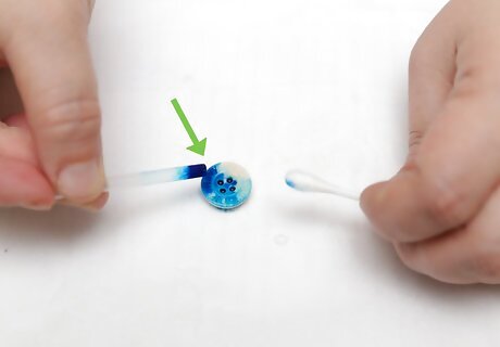 Place a few drops of ink onto your button. Start with a very small amount of ink. It is easier to build up color than it is to take it away. After you drop the ink onto your button, use a cotton swab to spread it around evenly across the surface of the button. Let this layer of ink dry completely before you continue with the process.