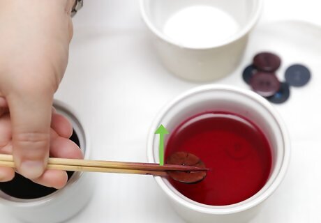 Place your buttons in the dye. The buttons should be completely submerged and have room to move within the container. You don’t want the buttons to touch, as this can create uneven color. Leave the buttons in the dye for two to five minutes. The longer you leave them, the darker the color will be. Check for color by using a spoon to gently lift one of the buttons out of the water. If the button is not yet the color you’d like to achieve, you can place it back into the dye bath for additional time. If desire a very light shade, check your buttons early, at exactly two minutes.