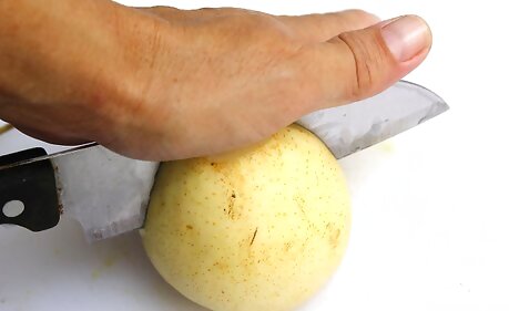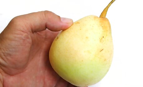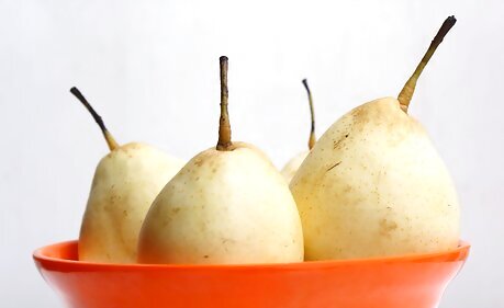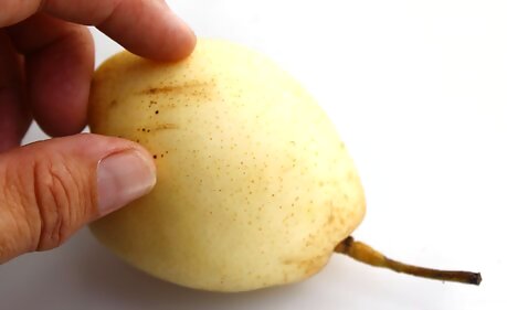Choose firm fruits without any blemishes. Like their softer pear cousins, Asian pears bruise easily, to the detriment of their texture and flavor. Small blemishes can be cut away when it's time to eat a pear, but it's worth taking the time to pick out unbruised pears when shopping. You may see Asian pears at the supermarket that are individually wrapped in protective mesh “sweaters” to limit bruising. Even so, take a peek underneath to check the skin for blemishes.