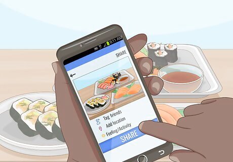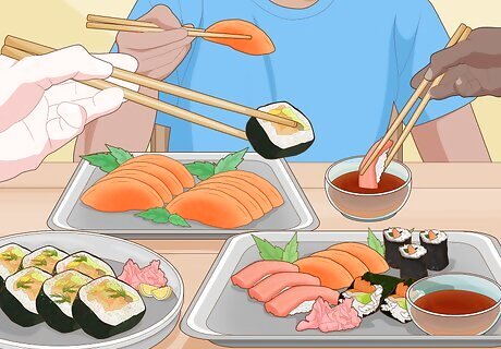 Share different types of sushi with a friend. You can enjoy a broader range of flavors and textures if you order several rolls or pieces of nigiri and sashimi to share. Keep in mind that when you remove pieces of sushi from a communal plate, use the blunt end of the chopsticks. This way you won't spread germs. It's perfectly fine to let your friend know if there are rolls or sashimi that you don't like. Just try to share the sushi that you both enjoy.