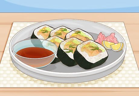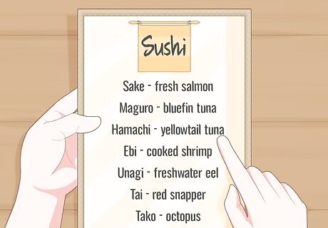 Try a variety of sushi to see what you like. If you're new to eating sushi, you might enjoy sushi rolls (maki) that include cooked fish, such as smoked salmon or tempura-fried seafood. To branch out, order a few pieces of nigiri or sashimi, including: Sake (pronounced "sha-ke") - fresh salmon Maguro - bluefin tuna Hamachi - yellowtail tuna Ebi - cooked shrimp Unagi - freshwater eel Tai - red snapper Tako - octopus