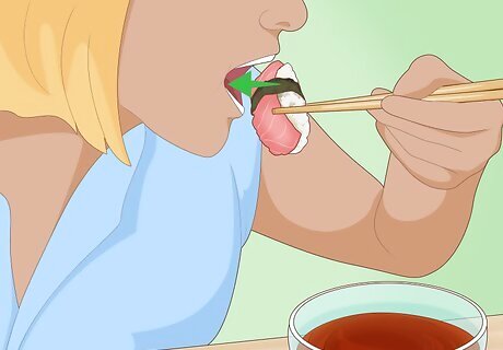 Try to eat the sushi in one bite. Most sushi is small enough to fit into your mouth all at once. Eating all of the sushi in a single bite will allow you to enjoy all of the flavors of the rice, wrapper, and fish. If the sushi is too large to fit into your mouth, you can eat it in 2 bites, but you may want to let the chef know that you prefer smaller pieces. Although some people argue that you must put the sushi fish-side down in your mouth, you can decide which way to eat the piece. Pay attention to how the flavors change as you eat the sushi. For example, you might notice a tender texture at first, followed by a slightly spicy finish.