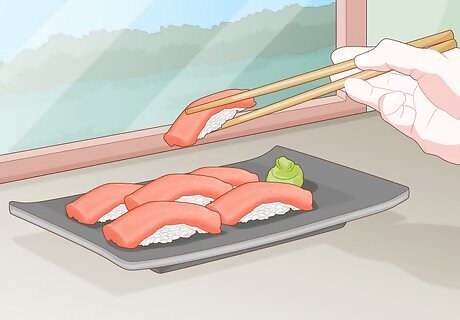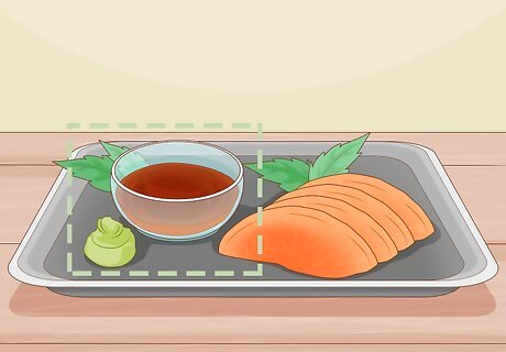Identify the wasabi and soy sauce. The server or chef will set down the plate of sushi you ordered, but you'll also notice a small empty dish, which you can pour soy sauce into, and a dab of green paste. The green paste is wasabi, which you can eat with the sushi to give it a little heat.Did You Know? Western-style wasabi is made with powdered horseradish, mustard seed, and food coloring. Authentic wasabi is grated wasabi root so it's much paler in color and less spicy. Sushi chefs add some wasabi to their rolls, so try the sushi before adding wasabi to your pieces. You'll also notice pickled ginger off to the side of the sushi. It will be pale or bright pink in color.