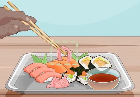 Eat bites of ginger in between different types of sushi to cleanse your palate. You probably ordered a few types of sushi, so you'll want to taste the difference between each of them. To refresh your mouth between different types of sushi, use your chopsticks to pick up a slice of ginger. Once you've eaten the ginger, you're ready to taste the next sushi. Avoid draping the ginger on the sushi and eating them together. Ginger is sometimes pale white or bright pink if food coloring has been added.