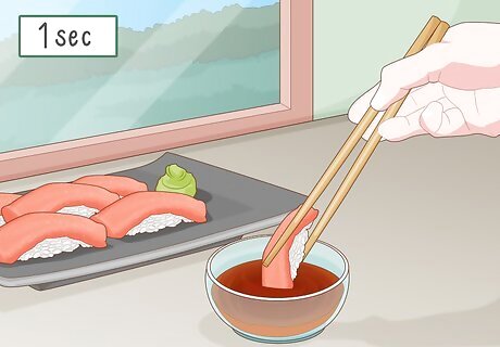 Dip the sushi in soy sauce if you'd like to enhance the flavor of the fish. Pour a little soy sauce into the empty dish on your sushi plate. Slowly dip the piece of sushi into the soy sauce for about 1 second. If you're eating nigiri, tilt the fish into the soy sauce instead of the rice so it doesn't fall apart. Since the chef has already seasoned the sushi, it's considered rude to soak an entire piece of sushi in soy sauce. Soaking the piece in soy sauce also makes it more likely to fall apart. Try not to mix wasabi into the soy sauce since this is seen as bad manners. If the sushi already has sauce on it, eat a piece before dipping it in soy sauce. You might enjoy the flavor that the chef has already prepared.