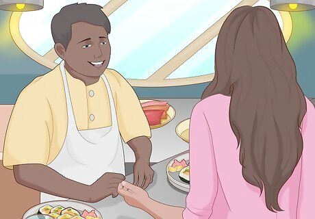 Sit at the bar if you want to interact with the sushi chef. If you enjoy watching how sushi is made, you'll have the best view if you're sitting at the bar. You can also ask the chef for recommendations or suggestions. For a quieter, more intimate meal, ask to be seated at a table instead of at the bar.