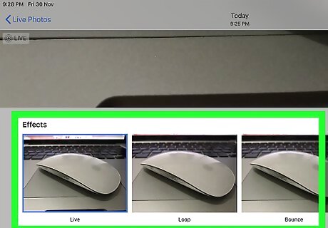Select an effect under the "Effects" heading. Tapping will apply the effect to your photo. Loop will turn your live photo into a standard video loop. Bounce will create another video loop that plays your live photo from the beginning to the end, then play it in reverse. Long Exposure will combine all the frames in your live photo, and turn it into one, single long-exposure frame.