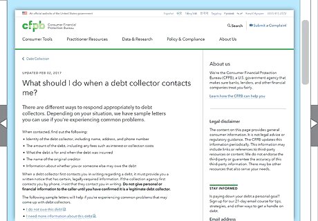 Request proof of the validity of the debt. If you get a call or a letter from a debt collector and you don't recognize the debt, tell the debt collector you want written proof that the debt is valid. The debt collector is legally obligated to provide this information to you. Do not discuss the debt further until you've received the validation notice. If the debt collector can't prove that the debt is valid and they have the right to collect on it, they won't be able to sue you in court for it (although they may try). Once you request proof of the validity of the debt, the debt collector is required to send it to you within 5 days. The validation letter includes the total amount owed, the date of the last payment, the name of the collector, and the name of the original creditor.Tip: It's good practice to request proof of the validity of the debt, even if you recognize the debt and don't dispute that you owe the money. You are not legally obligated to pay that money to a collector who can't establish they own the debt and have the right to collect on it.