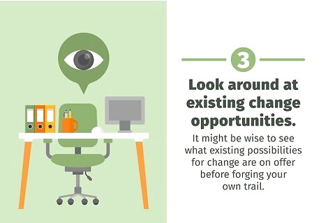 Look around at existing change opportunities. It might be wise to see what existing possibilities for change are on offer before forging your own trail. Is there a new project occurring that would allow you to sign on as part of your usual work role? If so, this could provide a great opportunity to expand your current role without you having to do all the groundwork. This can be really fruitful if the project is outside your usual work area.