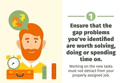 Ensure that the gap problems you've identified are worth solving, doing or spending time on. It will harm your career or trade trajectory if you're not doing your job properly, so make sure that before you take on additional tasks, they are completely aligned with what benefits the workplace and its mission. Working on the new tasks must not detract from your properly assigned job. To help you work out whether it is worth attacking the gaps from an organizational perspective, ask yourself these questions: What problem is my proposed change seeking to solve? What benefits will accrue to the organization if I solve this problem? (List them.) How will my new activities benefit my coworkers? (For example, better workflow for everyone, fewer delays, improved connections, etc.) In what ways will the workplace be more efficient as a result of my changes? What workplace or team goals will be met by my proposed changes? What costs or resources are required (if any) to implement my proposed changes? Are savings a high possibility? Is profit a possibility? What opportunities or improvements will this provide others in the workplace?