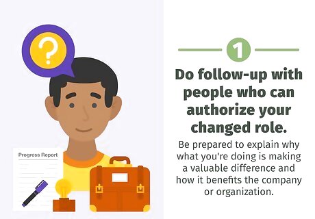 Do follow-up with people who can authorize your changed role. Using the experience you've gained from undertaking the new tasks or approaches, along with the records of the outcomes, talk to your supervisor/manager or other people who are in a position to agree to the changes. This step is crucial, otherwise your efforts may be overlooked or simply assumed as part of your existing role. Be prepared to explain why what you're doing is making a valuable difference and how it benefits the company or organization. Show as well as tell, providing evidence of improved workplace outcomes. Arguing the case for your role change will be easier if you can demonstrate clearly how things have already improved with the small changes you've been tackling.