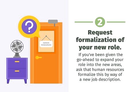 Request formalization of your new role. If you've been given the go-ahead to expand your role into the new areas, ask that human resources formalize this by way of a new job description. This will ensure that the new activities and the role expansion are officially recognized and become an expected part of the workplace routine. It also allows the role itself to become more desirable and to have ongoing value when you get promoted later, leaving your expanded role as a real position for someone else to step into at a later stage.