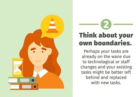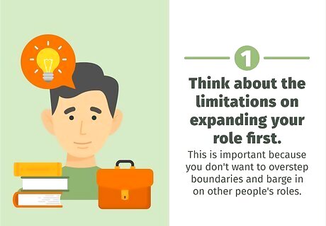 Think about the limitations on expanding your role first. This is important because you don't want to overstep boundaries and barge in on other people's roles. Trying to wrestle away tasks already done perfectly well by other colleagues won't win you any fans, so think through your expansion strategy with care. Some things to consider include: Choosing to expand into tasks the company or organization needs but are currently not being fulfilled by anyone; Checking that the company or organization hasn't already decided to recruit someone to attend to the issues you've identified as needing doing; Discerning between tasks that would truly be of benefit to increase work productivity and outcomes and tasks that, while they would be great if more resources and time existed, the workplace can still thrive without.