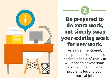 Be prepared to do extra work, not simply swap your existing work for new work. As earlier mentioned, it is probable (and indeed desirable initially) that you will need to devote some personal time to the gap problems beyond your normal job. Provided this doesn't go on for a long time, it will usually be helpful for you to do a few extra hours here and there during the work week to prove that these new tasks are of benefit to the company. A small sacrifice initially may help to persuade your supervisor and other relevant persons that your new activities are of great benefit to all.