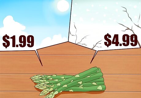 Look for what's in season. Asparagus can run $4.99 a bunch during winter months, but can be found for $1.99 a bunch during spring months. Take advantage of harvest seasons!