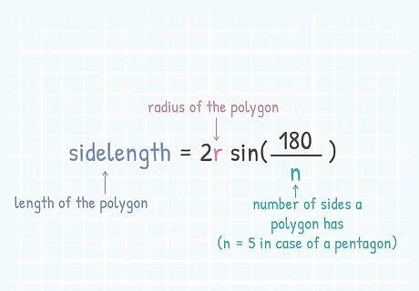 Study the equation that uses radius to find the length of one side. The equation to find the length of one side of a pentagon using the radius looks like this: s i d e l e n g t h = 2 r s i n ( 180 n ) {\displaystyle sidelength=2rsin({\frac {180}{n}})} {\displaystyle sidelength=2rsin({\frac {180}{n}})}. It may look a little complicated, but you can easily plug in the numbers that you already know to simplify the equation and find the length of a side. r represents the radius of the pentagon. n is the number of sides the pentagon has. sin is a trigonometric function using degrees that is easily plugged into a calculator.