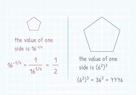 Solve the equation for the side length. If the side lengths are given as equations, you must solve them before finding the value of the pentagon’s perimeter. This will make it easier for you to find the perimeter more quickly. If the value of one side is 16 − 1 / 4 {\displaystyle 16^{-1/4}} {\displaystyle 16^{-1/4}}, then 16 − 1 / 4 {\displaystyle 16^{-1/4}} {\displaystyle 16^{-1/4}} must be simplified into 1 ( 16 1 / 4 ) {\displaystyle {\frac {1}{(16^{1/4})}}} {\displaystyle {\frac {1}{(16^{1/4})}}} 1 ( 16 1 / 4 ) {\displaystyle {\frac {1}{(16^{1/4})}}} {\displaystyle {\frac {1}{(16^{1/4})}}} = 1 16 4 {\displaystyle {\frac {1}{\sqrt[{4}]{16}}}} {\displaystyle {\frac {1}{\sqrt[{4}]{16}}}} which comes out to be 1 2 {\displaystyle {\frac {1}{2}}} {\frac {1}{2}}. If the value of one side is ( 6 2 ) 3 {\displaystyle (6^{2})^{3}} {\displaystyle (6^{2})^{3}}, simplify to 6 5 {\displaystyle 6^{5}} {\displaystyle 6^{5}} or 7776 {\displaystyle 7776} {\displaystyle 7776}.