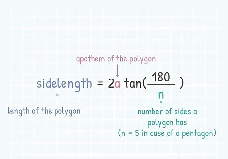 Enter the known values into the apothem equation. Once you know the apothem, you can combine it with the number of sides (always 5 for a pentagon) into an equation to calculate the length of one side. The equation for finding the length of one side of a pentagon using the apothem is: s i d e l e n g t h = 2 a ∗ t a n ( 180 n ) {\displaystyle sidelength=2a*tan({\frac {180}{n}})} {\displaystyle sidelength=2a*tan({\frac {180}{n}})}. a represents the apothem value. n is the number of sides the pentagon has. tan is a tangent function that can be performed on a calculator using degrees.