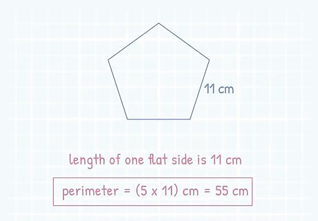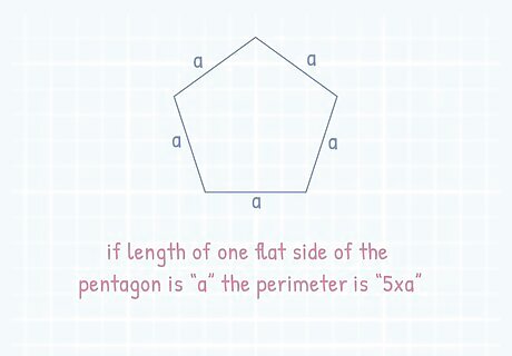 Identify the length of one flat side of the pentagon. The easiest way to find the perimeter of a pentagon is when the value of one side is already given to you. Each pentagon has five equal sides. If you are given the length of one side, it is easy to find the perimeter of the entire shape.
