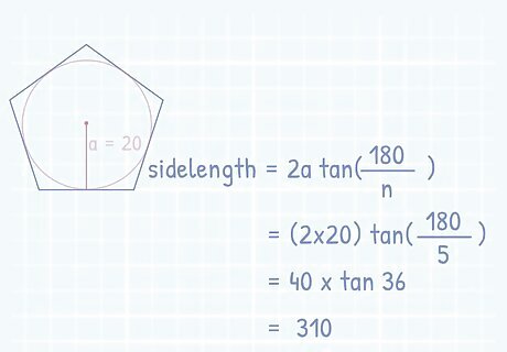 Solve the equation using the apothem value. Enter the value for the apothem into the equation for the letter ‘a’ and plug in the number of sides into the equation for the letter ‘n’. This will give you the value of one side of the polygon. If the value of the apothem is 20 {\displaystyle 20} 20, the equation would read s i d e l e n g t h = 2 ( 20 ) ∗ t a n ( 180 5 ) {\displaystyle sidelength=2(20)*tan({\frac {180}{5}})} {\displaystyle sidelength=2(20)*tan({\frac {180}{5}})}. s i d e l e n g t h = 40 ∗ t a n ( 36 ) {\displaystyle sidelength=40*tan(36)} {\displaystyle sidelength=40*tan(36)} which equals 310 {\displaystyle 310} {\displaystyle 310}.