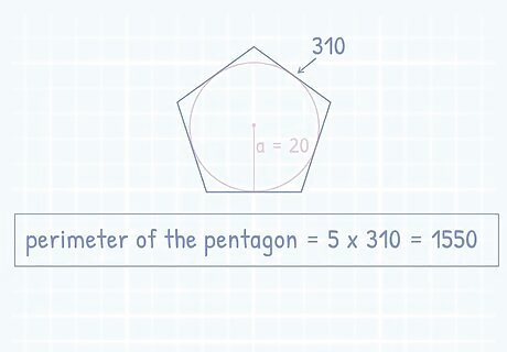 Calculate the final perimeter of the pentagon. Once you have figured out one side length using the apothem equation, you can find the perimeter of the pentagon by multiplying your answer by the number of sides in a pentagon. The equation you solved using the apothem gave you the value for one of the sides. Multiply your answer by 5. 310 ∗ 5 = 1550 {\displaystyle 310*5=1550} {\displaystyle 310*5=1550}.