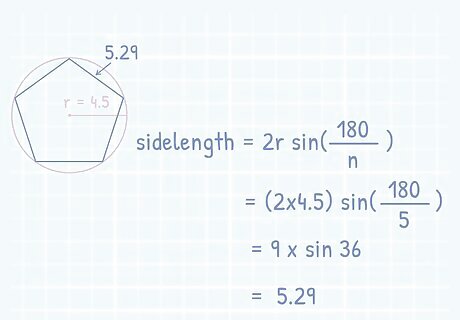 Plug the known values into the radius equation. Once you understand the equation to find side length using the radius of a pentagon, you can replace the letters with the numbers that you know. Replace the ‘n’ value with the number of sides (which for a pentagon is always 5) and the letter ‘r’ with the value given for the radius. If the radius is 4.5 {\displaystyle 4.5} {\displaystyle 4.5}, then 2 ( 4.5 ) ∗ s i n ( 180 5 ) {\displaystyle 2(4.5)*sin({\frac {180}{5}})} {\displaystyle 2(4.5)*sin({\frac {180}{5}})} would be your full equation. 2 ( 4.5 ) ∗ s i n ( 180 5 ) = 9 ∗ s i n ( 36 ) {\displaystyle 2(4.5)*sin({\frac {180}{5}})=9*sin(36)} {\displaystyle 2(4.5)*sin({\frac {180}{5}})=9*sin(36)} 9 ∗ s i n ( 36 ) = 5.29 {\displaystyle 9*sin(36)=5.29} {\displaystyle 9*sin(36)=5.29}