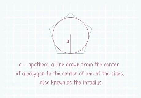Locate the apothem of the pentagon. The apothem is a line drawn from the center of a polygon to the center of one of the sides, also known as the inradius. It is different than the radius which is drawn from the center of the polygon out to one of the vertices (or points). If you are given the apothem of a pentagon, there is another simple equation you can use to find the length of one side. The value of the apothem will always be positive.