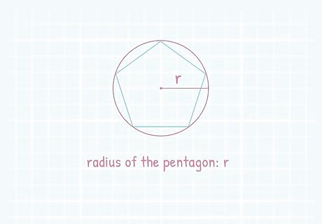 Locate the radius of the pentagon. The radius is a line drawn from the center of a shape to one of its vertices, also known as the circumradius. Pentagons have 5 vertices, or 5 points. For a pentagon, the radius would extend from the center of the shape out to one of the points. If you are given the radius of a pentagon, you can complete an equation that will give you the length of one of one side in order to calculate the perimeter. The value of a radius will always be positive.