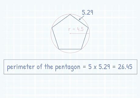 Multiply the answer by the number of sides. Once you have found the answer to the equation using the radius, solving for your final perimeter value is simple. To calculate the perimeter of the shape, multiply your answer to the equation by 5. 5.29 ∗ 5 = 26.45 {\displaystyle 5.29*5=26.45} {\displaystyle 5.29*5=26.45}
