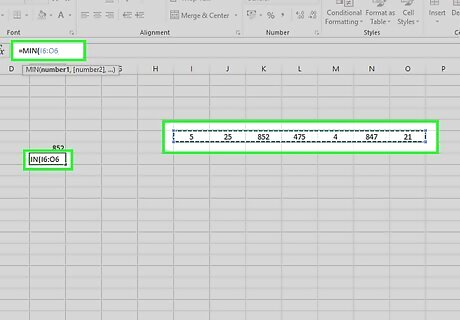 Find the minimum value of the data. To do this, pick a cell where you want the minimum to display (for example, maybe one cell above where you'll put the range, below the maximum). Type Min and specify the cells again. For example, you might write MIN(J7:T1) or MIN(A1:A500). Press ↵ Enter