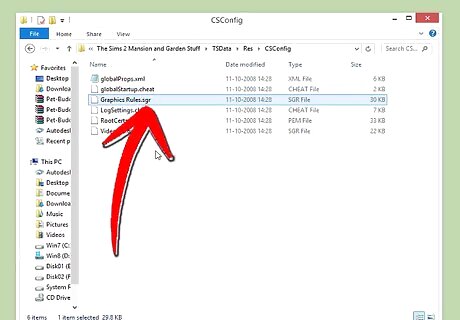 Find the Config folder. This will be where the appropriate file is located. On Windows, access EA Games > (your latest expansion pack) > TSData > Res > CSConfig. Make sure you access CSConfig rather than Config - both folders have Graphics Rules files, but you want to access the one in CSConfig. On Mac, access Contents > Resources > Config. The file in Config is the proper file - there's no CSConfig in the Resources folder.