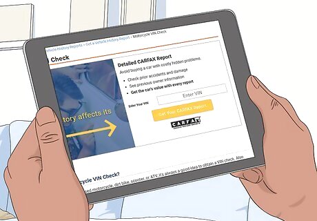 Trace the VIN number. The VIN number is a great way for one to protect themselves from getting scammed. These numbers show the bike's history from the beginning and state whether it's been stolen, damaged, and old maintenance records. Checking the VIN number on the DMV website prior to purchase is very important. To do this, go to https://www.dmv.org/motorcycle-vin-check.php and type the VIN in the search engine where it say’s "Enter your VIN." Examine the report for mileage tampering (mileage is lower than the previous year or last time the mileage was recorded) and any reports of theft.