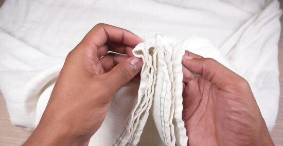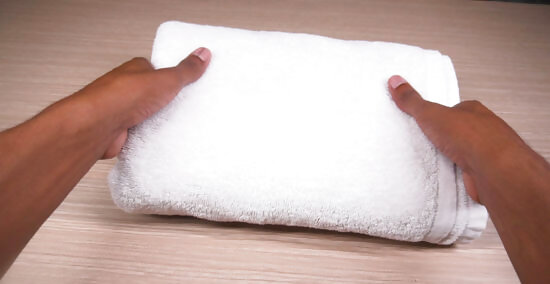 Fold a towel in thirds to take up less space. First, hold the towel out in front of you by 2 corners on a short side. Bring the bottom corners up to match the top corners, folding the towel in half. Shake it out, and then lay it on a flat surface to match up all the edges and corners, smoothing it out as you go. Bring the folded edge at the bottom up to meet the corners at the top, smoothing it out again and making sure everything is even. Finish by turning the towel so the long side faces you. Divide that side into thirds visually, and fold the towel along those lines, wrapping it around itself as you go.