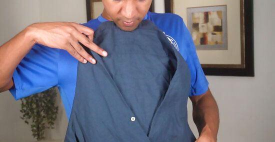 Fold tailored shirts on a flat surface to keep wrinkles to a minimum. Lay your shirt down face-down on the flat surface and smooth out the wrinkles with your hands. Pull the sleeves in vertically to the center of the shirt, overlapping them at the middle. Fold the outer edges of the shirt to the center, creating a line down the back of the shirt with the seams. Pull the bottom half of the shirt up towards the top to finish the fold. Pull the bottom half up a second time if you want a shorter fold. Smooth out any wrinkles each time you make a fold.