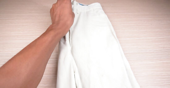Fold jeans and other casual pants 4 times for better storage. Hold the jeans out in front of you. Bring one pant leg over the other side, smoothing and shaking as you go. Fold the pants in half lengthwise, bringing the bottom seam up just under the waist of the jeans. Fold them in half lengthwise again, bringing the folded edge up just under the waist of the jeans. Leaving the waist of the jeans out of the fold helps the jeans lay flatter, as the waist creates a bulge almost equal to the other folds. Folding the jeans 4 times allows you to store them compactly in a drawer or on a shelf.
