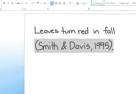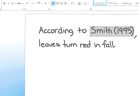 Choose how you will create your in-text citation. You have two basic ways that you can make a citation. You can name your author at the beginning of the sentence like this, using only the last name: “According to Smith (1995), leaves turn red in the fall.” Notice that in this instance, the date is in parentheses while “Smith” is not. The other way you can make an in-text citation is to put a citation at the end of the sentence without directly referencing the author in the sentence. This would look like the example: “Leaves turn red in the fall (Smith, 1995).” In this case, both the author and the date are in parenthesis, divided by a comma. Always put the author first and then the date.