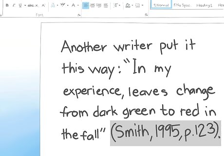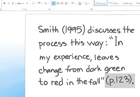 Write the page number if you are using a direct quote. In some instances, you'll also need the page number to explain where you found the information. You must have the page number if you are using a direct quote. Let's say you found this quote on page 123: “In my experience, leaves change from dark green to red in the fall.” You can cite this information in one of two ways. Whichever way you choose, always put the page number at the end of the sentence, even if you introduce the author and date at the beginning. Method 1: To use this quote, you would cite your source this way: “Smith (1995) discusses the process this way: 'In my experience, leaves change from dark green to red in the fall' (p. 123).” The page number is always last, and you put a “p” followed by period before it. Method 2: You could also write it this way: “Another writer put it this way: 'In my experience, leaves change from dark green to red in the fall' (Smith, 1995, p. 123).” Just like before, you put the information in parenthesis at the end of the sentence and separate it with commas.
