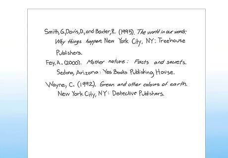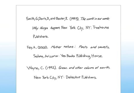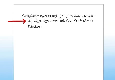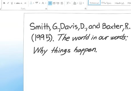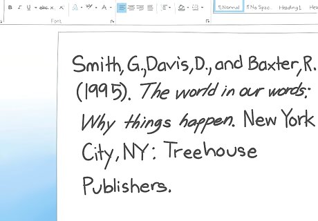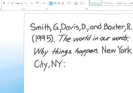 Write down the city and state where the book was published. The city of publication is usually on the title page or the back of the title page. If there are multiple cities, pick the one closest to where you are. Use the postal abbreviation for the state, and don't use periods between the letters. Do use a comma between the city and state. If your book was published in New York City, the citation would be: “Smith, G. Davis, D., and Baxter, R. (1995). The world in our words: Why things happen. New York City, NY.”