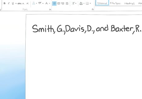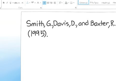 Add the date of publication to the citation. Next, you'll put the date in parenthesis, followed by a period. Here's an example: “Smith, G. Davis, D., and Baxter, R. (1995).”