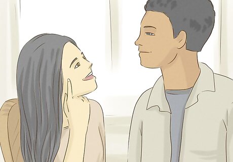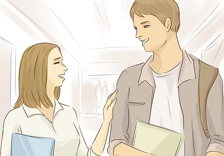 Brush against him or casually touch his arm to break the touch barrier. Touching a guy is also a great way to flirt without saying anything. It guarantees that he’ll notice you and may make him start thinking about touching you. If you’re nervous, simply brush against him while you’re passing him. If you’re more bold, lightly touch his arm while you’re talking to him. When you brush against him, say something like, “Oh, I’m sorry,” or “These halls are too narrow.” You might touch his arm and ask him a question like, “Do you know when our essay is due?” or “Can you tell me where the nearest coffee shop is?”