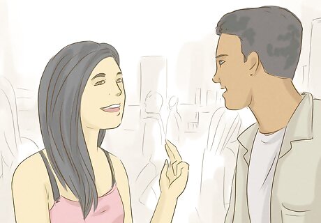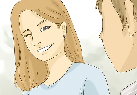 Make eye contact and smile at him for 2-3 seconds. Eye contact shows him that you noticed him. If you also smile, he’ll know you might be interested. Plus, smiling makes your face look more attractive. Whenever you’re around him, look him in the eye and smile. Don’t stare at him longer than 3 seconds because he’ll get uncomfortable.