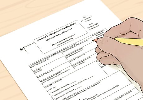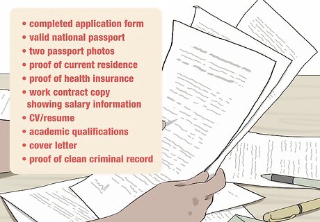 Obtain an EU Blue Card. An EU Blue Card is a special type of visa designated for educated and skilled workers. It's a work and residence permit that is valid in all EU member states. The Blue Card is reserved for university graduates who already have a job lined up in Germany, and make a minimum gross salary, depending on what field you’re in. To obtain your Blue Card you must provide the following to your local German consulate: A complete application form from the EU website. Your university diploma. A valid work license and proof of salary. A written verification from your employer that you hold this job. Two passport-sized photos, no older than 6 months.