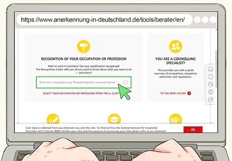 Check if there is demand for your qualifications. The website https://www.anerkennung-in-deutschland.de/tools/berater/en/ is run by the German government. It allows you to enter your qualifications and job field to receive information on job availability, resources, and officials you can speak to. Starting here will give you a host of resources that will make your job search easier. This process starts by asking for the field you specialize in. Remember that Germany seeks skilled and educated workers for employment permits, so you should already have a clear idea of what your field is. The website then asks which location in Germany you want to work. The site recommends picking a specific location even if you aren't sure yet, because you'll then have access to specific information and officials who can assist you further. Read the information you receive and contact any resources that the site recommends. Following these leads will show you how likely it is for you to find work in Germany.