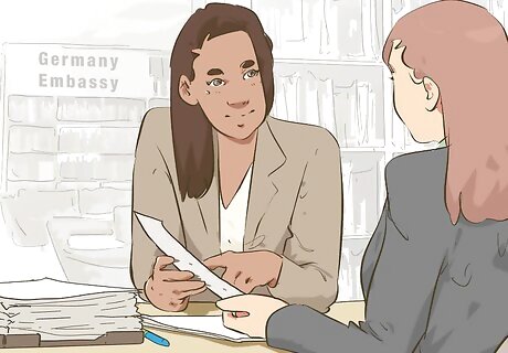 Apply for a Germany work visa. While citizens of several countries can enter Germany without a visa, you can't begin working until you have a proper work visa. After you have a concrete job offer, you're eligible for a Germany work visa. To apply, you have to submit the following to your local German consulate. A completed application form (available here: https://www.germany.info/blob/937348/f9342033f2933dc05da54151efe283db/application-form-residence-permit-data.pdf) and accuracy of information form (available here: https://www.germany.info/blob/898362/97f48cf1d35dc3ce96dfbe9095c586b9/visa-declaration-data.pdf); a valid national passport; two passport photos; proof of current residence; proof of health insurance from your German employer; a copy of your work contract showing salary information; CV/resume; academic qualifications like a diploma; cover letter explaining the reasons for your stay in Germany; and proof of clean criminal record. Remember that processing a work visa can take 1 to 3 months. You should start the process as soon as you have a job offer so the process can be completed by the time you move. The work visa fee is 75 euros.