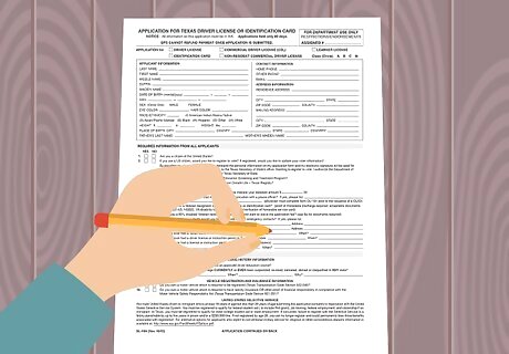 Take the necessary documents to the driver license office. When you are ready, you will need to take the following information with you to your nearest driver license office: Proof of identification. This can be a U.S. Passport, or a birth certificate together with a social security card. There are some other documents that could be used instead, but these are the most common. Proof of Texas residence. This may be a mortgage, lease, home insurance policy, credit card statements, or similar items. You need to bring two separate items of proof. The completed application form. If you own your car, you need to bring proof of registration and insurance. If not, then you need a statement that says you do not own a car. License fee. The fee for a license for anyone ages 18 to 84 is $25. You can pay by credit card, cash, check or money order. After age 84, the fee drops to $9, but the license must be renewed every two years instead of the previous six.