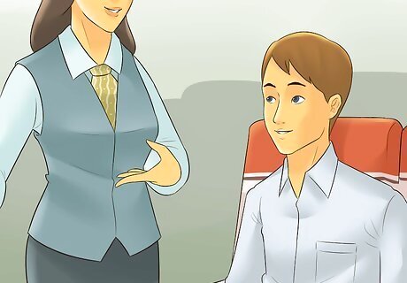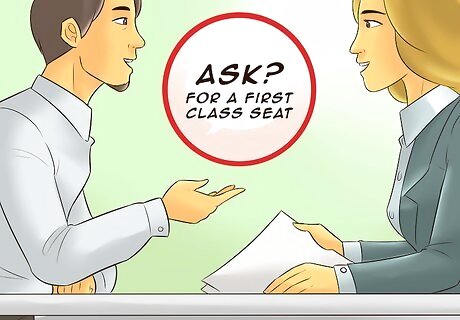 Ask a flight attendant for an upgrade if you see a seat available. Typically flight attendants never upgrade passengers and simply asking for an upgrade is not going to work. However, there are legitimate reasons why a flight attendant might upgrade you. Here are a few: A problem with your seat. In some cases where your seat has malfunctioned and you cannot comfortably sit there, i.e. a seat-belt problem or the seat will not stay in the up position, the flight attendant will make an attempt to find you another seat. If no other seats are available in coach yet space is available in first, you may be moved to first class. However, this is a very rare occurrence, and you should never try to purposely break your seat. Also note that if there is an elite flier in coach, they may get the bump to first class, and you would take the elite member's old seat. Choose Seats at the bulkhead, where families with children get seated. This can result in an upgrade if they need your seat, which they often do. A problem with a fellow passenger. If by chance you are sitting next to a passenger and you have a legitimate complaint such as harassment, the flight attendant can, at their discretion, move you to another seat. If there are only seats available in first class, up you go!