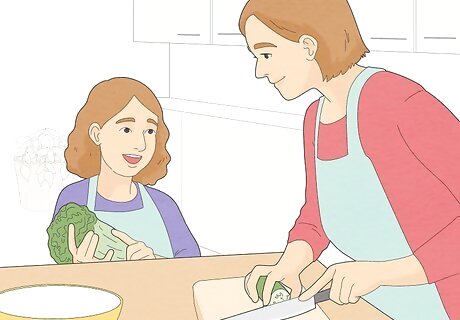 Help your parents prepare meals. Get involved in meal making and preparing food, as this will allow you to choose healthy ingredients and know exactly what is in your food. Offer to do small things in the kitchen to help out your parents while they cook. They will likely appreciate the help and this way you have direct contact with your food before you eat it. You may not feel comfortable using a knife, and your parents may not want you to use one either. Think of other things you can do to help out in the kitchen and get involved, like peeling vegetables or washing and cleaning fruit. You could also do the dishes or keep the counter clean for your parents while they cook.