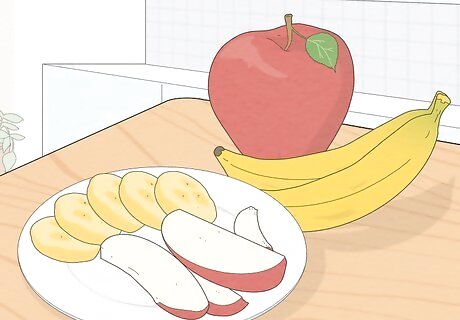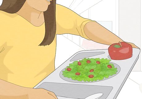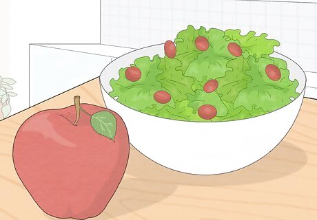 Add fruits and vegetables to your diet. You should consider your current diet and try to add in healthier food choices, like more fruits and vegetables. Eating fresh produce can help you stay fit and healthy. Make sure you have at least five servings of fruits and vegetables a day, scattered throughout your meals. This may mean that you have one to two servings of fruits and vegetables at breakfast, a serving of fruit and/or veggies at lunch, another serving as a snack, and a final serving at dinner. One serving of fruits could be an apple or a banana. One serving of vegetables could be 1/2 cup of raw, chopped vegetables or 1 cup of leafy green vegetables like spinach or kale.