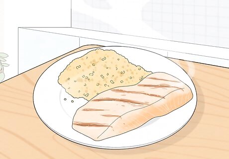 Have healthy grains and proteins. Grains and proteins help give you enough energy to stay upbeat and have energy through your day. Having healthy grains, which do not include very much fat, starch, or sugar, will help your metabolism stay healthy and keep your immune system strong. Go for healthy grains like brown rice or quinoa instead of pasta and white rice. Opt for lean sources of protein like baked chicken or baked fish, rather than lots of red meat and salty lunch meats.